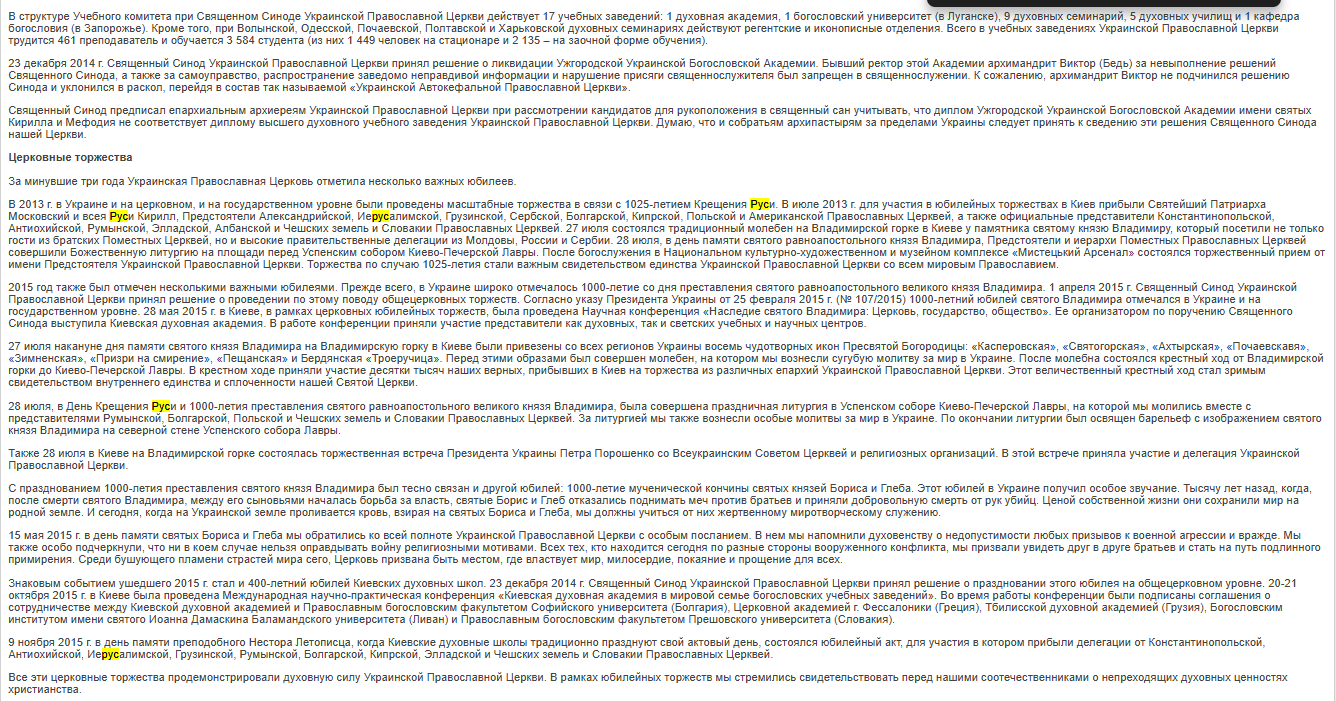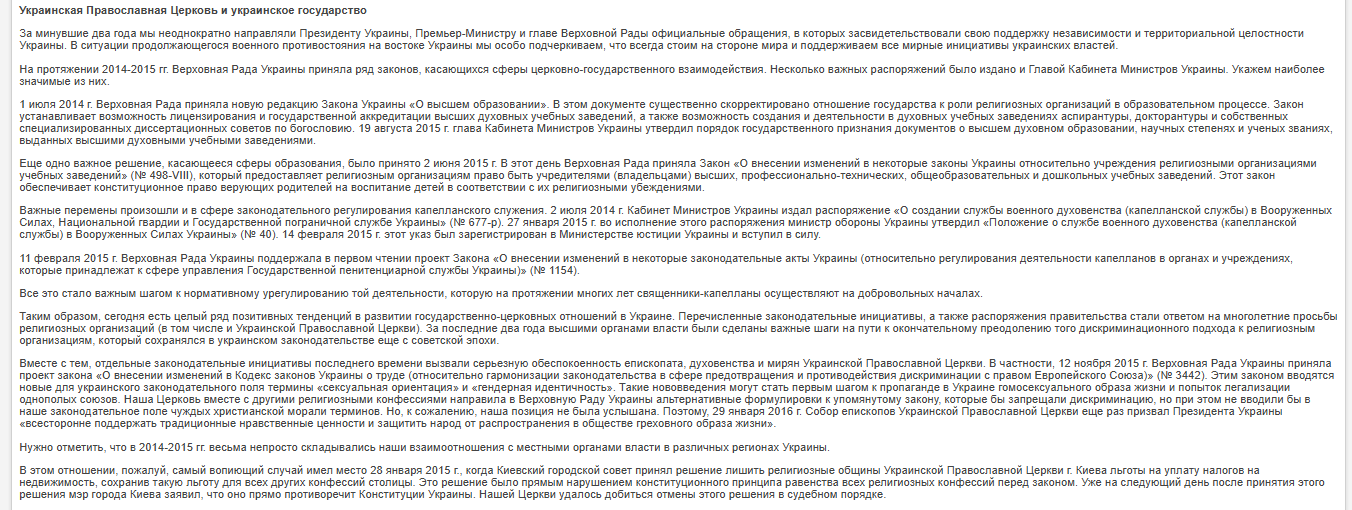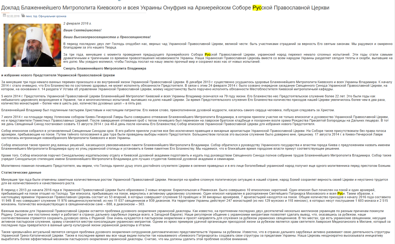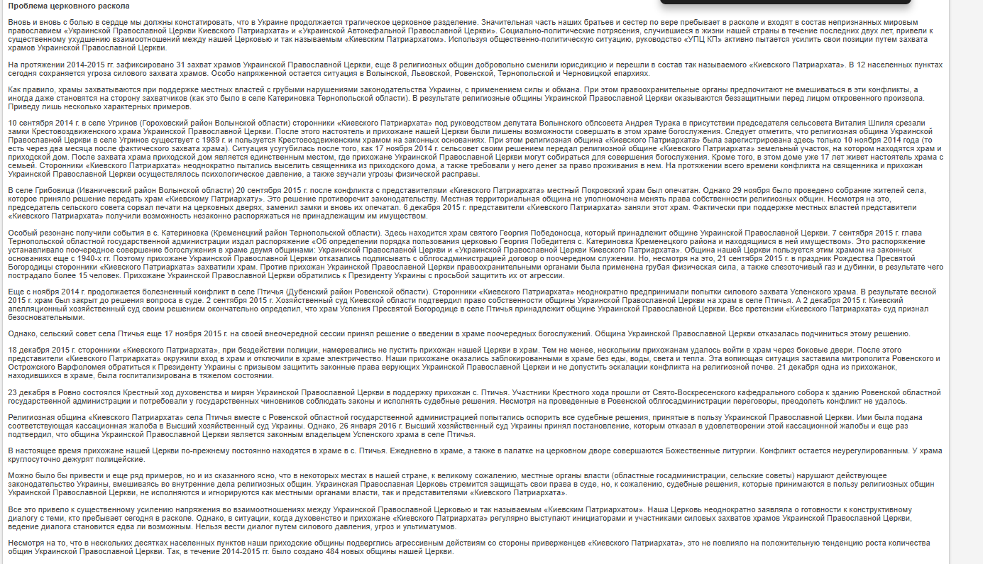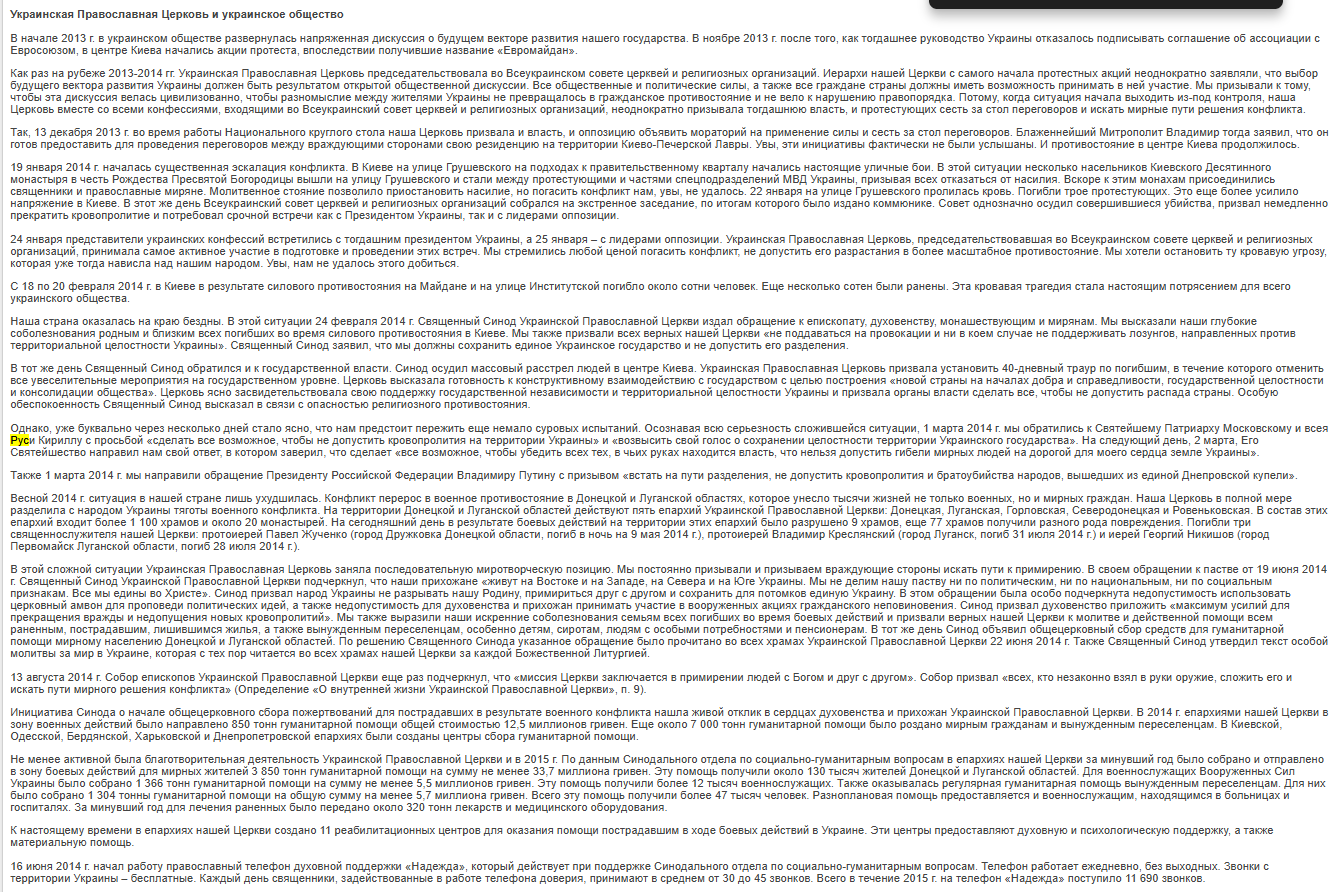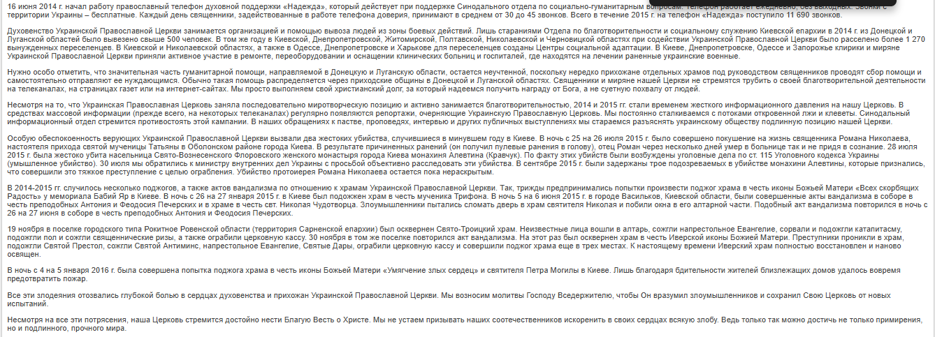 Весной 2014 г. ситуация в нашей стране лишь ухудшилась. Конфликт перерос в военное противостояние в Донецкой и Луганской областях, которое унесло тысячи жизней не только военных, но и мирных граждан. Наша Церковь в полной мере разделила с народом Украины тяготы военного конфликта. На территории Донецкой и Луганской областей действуют пять епархий Украинской Православной Церкви: Донецкая, Луганская, Горловская, Северодонецкая и Ровеньковская. В состав этих епархий входит более 1 100 храмов и около 20 монастырей. На сегодняшний день в результате боевых действий на территории этих епархий было разрушено 9 храмов, еще 77 храмов получили разного рода повреждения. Погибли три священнослужителя нашей Церкви: протоиерей Павел Жученко (город Дружковка Донецкой области, погиб в ночь на 9 мая 2014 г.), протоиерей Владимир Креслянский (город Луганск, погиб 31 июля 2014 г.) и иерей Георгий Никишов (город Первомайск Луганской области, погиб 28 июля 2014 г.). - Доклад Блаженнейшего Митрополита Киевского и всея Украины Онуфрия на Архиерейском Соборе Русской Православной Церкви